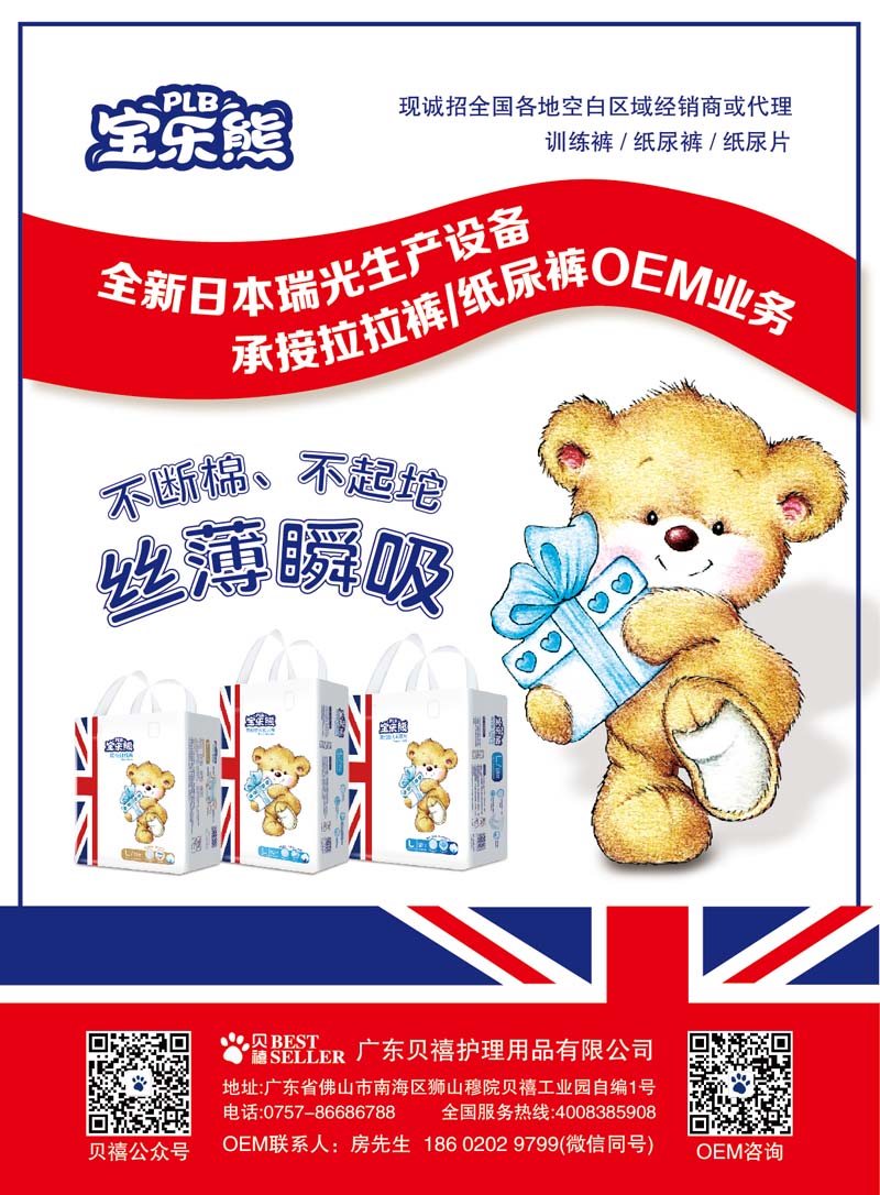 寶樂熊是廣東貝禧護理用品有限公司旗下主打品牌,有紙尿褲、紙尿片、拉拉褲三大系列。采用絲薄瞬吸芯體,不起坨、不斷棉。高效透氣底層+打孔面不雙向透氣,排出悶熱濕氣,保持屁屁干爽舒適。雙層立體褶邊有效防止尿液側(cè)漏,大面積透氣腰圍,有效減少后漏;強力SAP高分子吸收珠珠,快速吸收。柔軟合身,貼身保護。