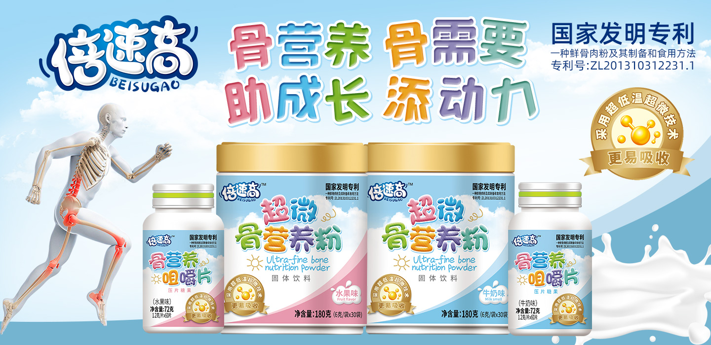 品牌名稱:倍速高 主營產(chǎn)品:倍速高超微骨營養(yǎng)粉,咀嚼片 品牌特色:科學(xué)營養(yǎng) 助力健康