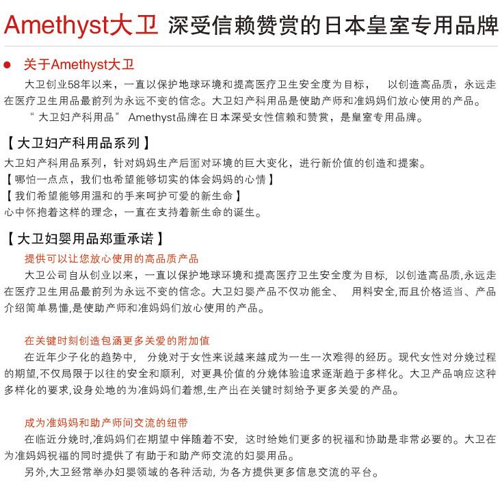 大衛(wèi)公司自從創(chuàng)業(yè)以來,一直以保護(hù)地球環(huán)境和提高醫(yī)療衛(wèi)生安全度為目標(biāo),以創(chuàng)造高品質(zhì),永遠(yuǎn)走在醫(yī)療衛(wèi)生用品最前列為永遠(yuǎn)不變的信念。大衛(wèi)婦嬰產(chǎn)品不僅功能全、用料安全,而且價(jià)格適當(dāng)、產(chǎn)品介紹簡單易懂,是使助產(chǎn)師和準(zhǔn)媽媽們放心使用的產(chǎn)品。