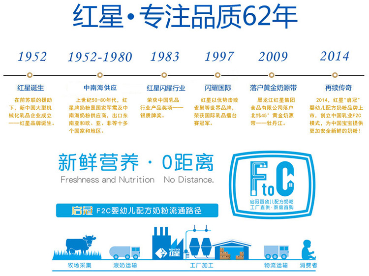 2014,紅星“啟冠”嬰幼兒配方奶粉品牌上市,創(chuàng)立中國(guó)乳業(yè)首個(gè)F2C模式,為中國(guó)寶寶提供更加安全新鮮的奶粉!
