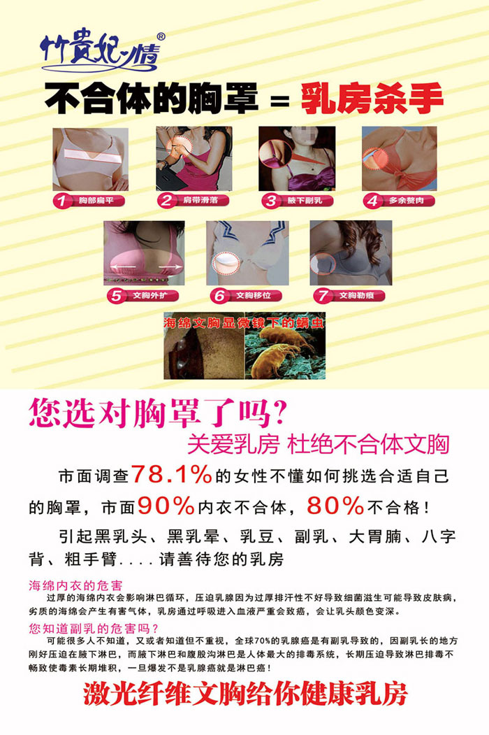品牌名稱:竹貴妃情 主營產(chǎn)品:竹貴妃情激光纖維文胸,竹貴妃情能量褲 品牌特色:工藝升級(jí),親膚舒適