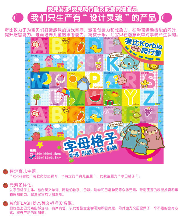 “考比Korbie”嬰兒爬行墊,是杭州杰弗瑞嬰童用品有限公司旗下的主打品牌產(chǎn)品。Korbie,源自德文“korb”,是“籃子”的意思。考比Korbie,給爸爸媽媽一個放心的“籃子”,為寶寶的成長創(chuàng)造一個安全、舒適和快樂的小天地。