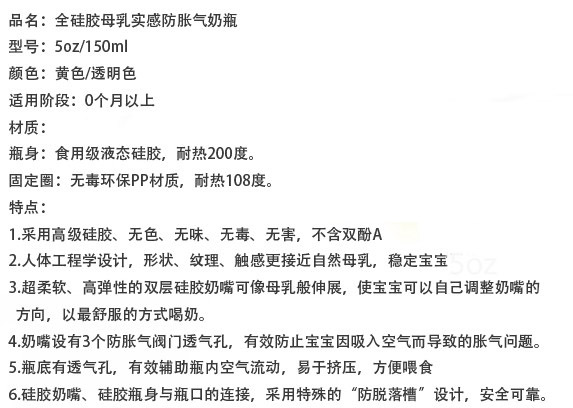 硅膠很柔軟,不用奶瓶刷用手也可以刷到奶瓶的各個角落,容易清洗。寶寶吸奶時,奶瓶會隨著奶水的減少而自動收縮,始終保持著瓶身內(nèi)外氣壓一致,避免寶寶吸入過多的空氣而導(dǎo)致嗆奶、腹脹等不適,有效解決喂奶時脹氣的煩惱,從而達到自動呼吸的功能。