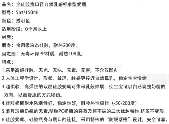 本品采用高級食品級矽膠(Liquid Silicone)制成,無毒、無味、耐高溫120℃可消毒、極好韌性、不易破、更耐用。本品對嬰兒牙床的發(fā)育和牙齦的保護(hù)有特殊效果。能促進(jìn)嬰兒牙齒的正常發(fā)育及臉部肌肉運(yùn)動。