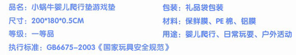 小蝸牛爬行墊無(wú)毒無(wú)味,防潮隔濕,超大無(wú)縫,表面附帶精美的童話圖案,從寶寶學(xué)爬到練習(xí)走路,再到大點(diǎn)在地上玩耍蹦跳,都是不錯(cuò)的選擇,是寶寶健康快樂(lè)成長(zhǎng)的好伴侶。