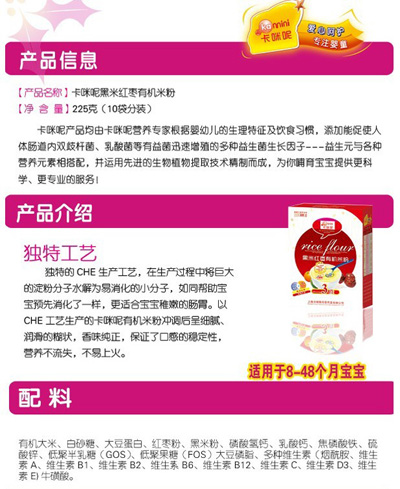 卡咪呢有機米粉系列是專為中國寶寶設(shè)計的營養(yǎng)輔食,選用有機大米,科學(xué)搭配維生素AD等維生素,還特別添加牛磺酸、DHA、AA等有助智力發(fā)育的營養(yǎng)成分,富含15種營養(yǎng)素。現(xiàn)上?ㄟ淠啬笅胗闷酚邢薰久嫦蛉珖瞻资袌鰠^(qū)域誠招卡咪呢有機米粉代理商。