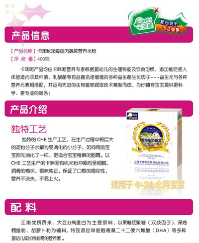 卡咪呢有機(jī)米粉系列是專(zhuān)為中國(guó)寶寶設(shè)計(jì)的營(yíng)養(yǎng)輔食,選用有機(jī)大米,科學(xué)搭配維生素AD等維生素,還特別添加;撬、DHA、AA等有助智力發(fā)育的營(yíng)養(yǎng)成分,富含15種營(yíng)養(yǎng)素。現(xiàn)上?ㄟ淠啬笅胗闷酚邢薰久嫦蛉珖(guó)空白市場(chǎng)區(qū)域誠(chéng)招卡咪呢有機(jī)米粉代理商。