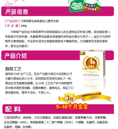 卡咪呢乳清蛋白嬰幼兒營養(yǎng)米粉是上?ㄟ淠啬笅胗闷酚邢薰酒煜庐a(chǎn)品,精選優(yōu)質(zhì)大米制作,特別添加乳清蛋白和益生元,提高寶寶抵抗力,促進(jìn)寶寶changdao的消化吸收,上市以來廣受父母消費者的青睞。