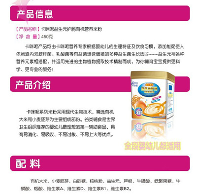 卡咪呢有機米粉系列是專為中國寶寶設(shè)計的營養(yǎng)輔食,選用有機大米,科學(xué)搭配維生素AD等維生素,還特別添加;撬帷HA、AA等有助智力發(fā)育的營養(yǎng)成分,富含15種營養(yǎng)素。現(xiàn)上?ㄟ淠啬笅胗闷酚邢薰久嫦蛉珖瞻资袌鰠^(qū)域誠招卡咪呢有機米粉代理商。