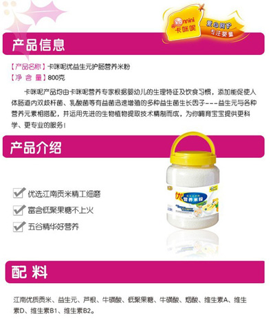 卡咪呢有機(jī)米粉系列是專為中國(guó)寶寶設(shè)計(jì)的營(yíng)養(yǎng)輔食,選用有機(jī)大米,科學(xué)搭配維生素AD等維生素,還特別添加牛磺酸、DHA、AA等有助智力發(fā)育的營(yíng)養(yǎng)成分,富含15種營(yíng)養(yǎng)素。現(xiàn)上?ㄟ淠啬笅胗闷酚邢薰久嫦蛉珖(guó)空白市場(chǎng)區(qū)域誠(chéng)招卡咪呢有機(jī)米粉代理商。