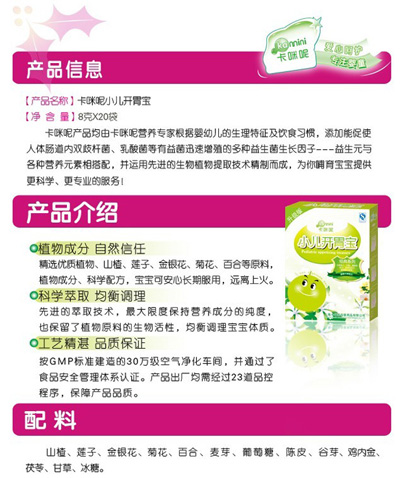卡咪呢小兒板藍根顆粒是上?ㄟ淠啬笅胗闷酚邢薰酒煜庐a(chǎn)品,專為嬰幼兒設(shè)計,專業(yè)、安全,幫助寶寶可以預(yù)防感冒抵抗病毒,是廣大父母育兒的好幫手?ㄟ淠匦喊逅{根顆粒不含任何色素、防腐劑,安全放心。