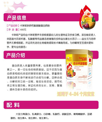 蛋白質(zhì)是人體重要營(yíng)養(yǎng)素,也是多的營(yíng)養(yǎng)素之一,是一切生命的物質(zhì)基礎(chǔ),可以保證機(jī)體的生長(zhǎng)、發(fā)育、繁殖、遺傳及修補(bǔ)損傷的組織。上海卡咪呢母嬰用品有限公司是專(zhuān)業(yè)的母嬰營(yíng)養(yǎng)品企業(yè),針對(duì)中國(guó)孕嬰童體質(zhì)推出了卡咪呢蛋白質(zhì)粉系列產(chǎn)品,現(xiàn)面向全國(guó)招商。
