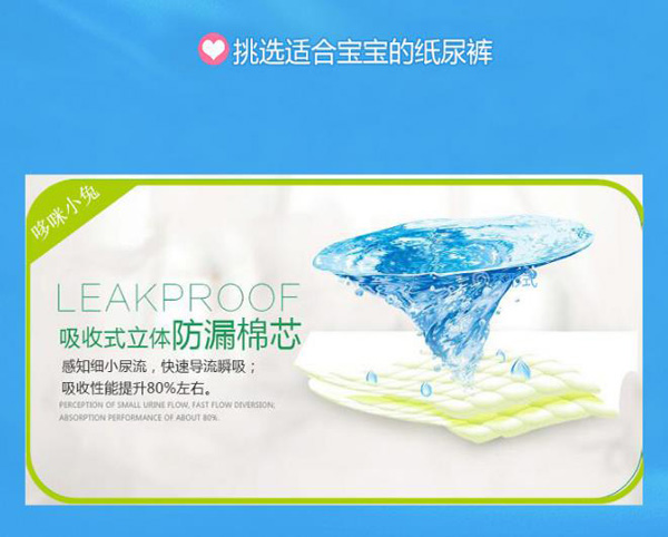 柔薄芯層結(jié)構(gòu),采用全芯高科技結(jié)構(gòu)設(shè)計(jì)、薄軟透氣、零接觸摩擦感、不起坨、不斷層、輕輕的呵護(hù),給寶寶體貼的愛(ài)。綿柔無(wú)紡布透氣底膜,及時(shí)散發(fā)悶熱濕氣,減少寶寶皮膚的刺激及傷害。全新3D打孔大珍珠面層,瞬間吸收,加倍干爽,連通吸收芯成(多層鎖水)系統(tǒng),有效吸收和鎖住更多尿液,讓寶寶屁屁更加干爽。雙重防漏立體設(shè)計(jì),舒適柔軟貼合腿部,防止尿尿往兩邊側(cè)漏,給寶寶自由自在,盡情活動(dòng)的舒爽空間。人性化合身曲線(xiàn)剪裁,專(zhuān)為中國(guó)寶寶設(shè)計(jì)的合身檔剪裁,更加貼合寶寶,腿部及臀部曲線(xiàn),減少腿部摩擦與壓力。背部彈性腰圍貼身防后漏,無(wú)論寶寶坐、騎、爬等,大環(huán)腰彈性腰圍能自然伸縮,貼身服帖。