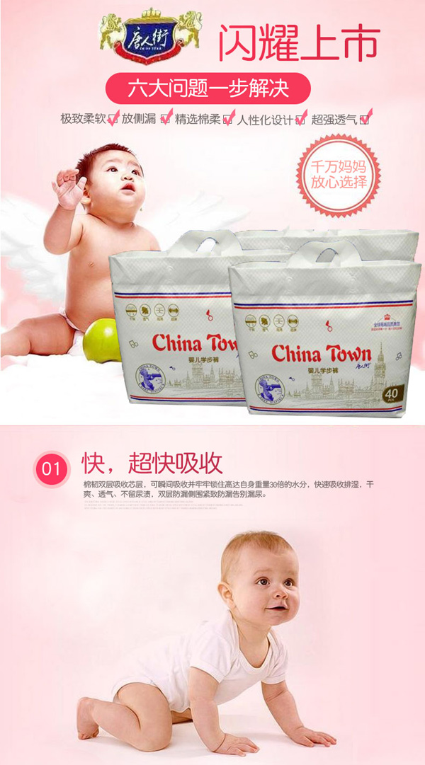 采用全芯體吸收層,不斷裂,不起坨,貼身綿柔,配合科學(xué)化的產(chǎn)品設(shè)計(jì)不僅讓尿液吸收速度加快更令吸收量大幅度提升到了800ml。極致熱風(fēng)底膜,超過(guò)10000個(gè)透氣孔,透氣舒適。親膚透氣底膜,良好的透氣性的PE膜,形成有效的縱向?qū)α骺焖賹?dǎo)出廢氣和濕氣,沒(méi)有紅屁屁,讓寶寶的皮膚盡情的呼吸。360°雙層立體防側(cè)漏,寶寶怎么動(dòng)都不怕。