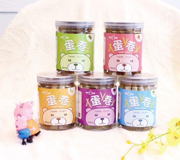 艾比小熊蛋卷系列共包含5種口味,紫薯、椰奶、香蕉、海苔、草莓;精選面粉,含礦物質(zhì)、無(wú)機(jī)鹽、蛋白質(zhì),加入雞蛋液、各種果蔬汁、奶汁、海苔碎片等,經(jīng)成糊、成卷、涂抹植物油烤焙而得,蛋卷色澤金黃偏向其中所加