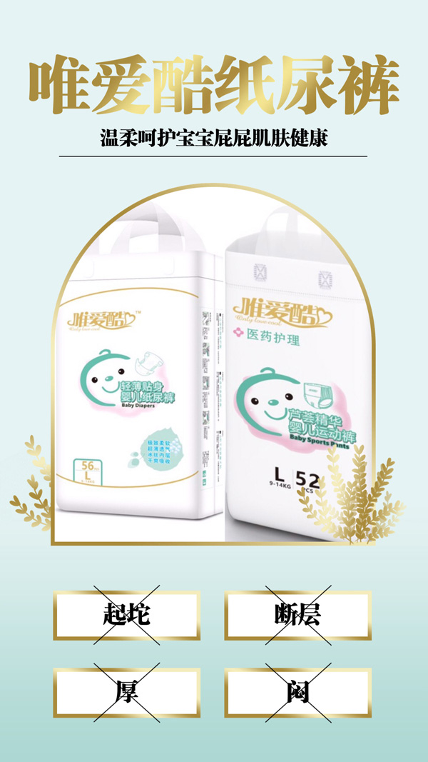 唯愛酷紙尿褲采用了高密度的材料,能防止尿液反滲,持久干爽。