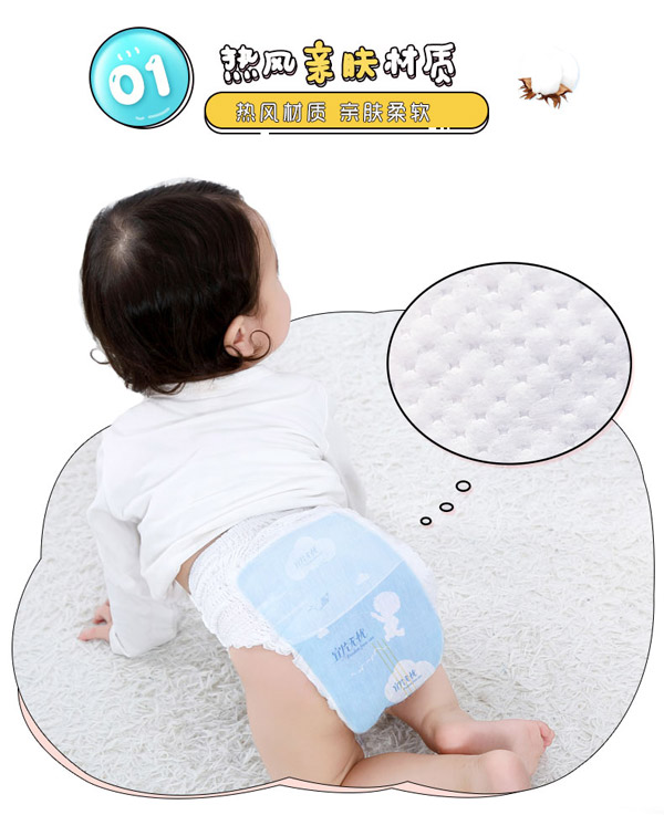 宜片無憂童趣紙尿褲采用熱風(fēng)材質(zhì),親膚柔軟,選用柔軟熱風(fēng)凸點無紡布作為面料,具有蓬松度高,彈性好,手感柔軟,透氣性好等特點,寶寶穿著舒適,玩的開心,睡得安心。
