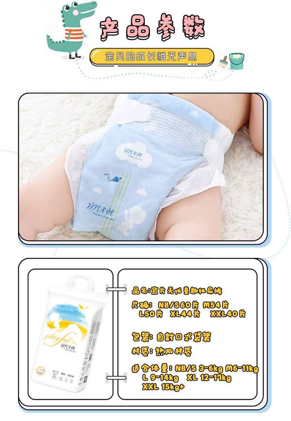 宜片無憂童趣紙尿褲采用熱風(fēng)材質(zhì),親膚柔軟,選用柔軟熱風(fēng)凸點(diǎn)無紡布作為面料,具有蓬松度高,彈性好,手感柔軟,透氣性好等特點(diǎn),寶寶穿著舒適,玩的開心,睡得安心。