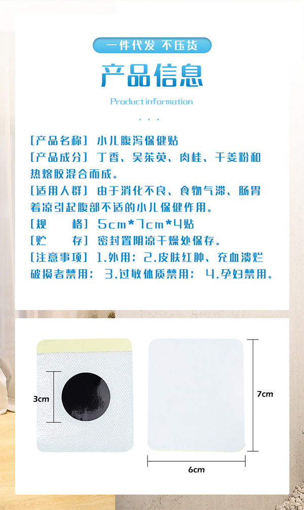 小兒腹瀉貼,以丁香、吳茱萸、肉桂、丁香粉等為原料,科學配比,溫和配方,快速吸收,低敏透氣,無殘留。不打針、不吃藥,守護健康。