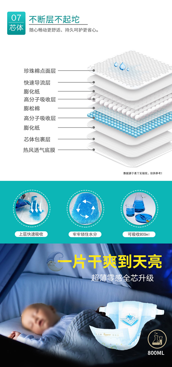進口高分子結(jié)構(gòu),可以吸收約自身重量30倍的水分,保持屁屁持久干爽