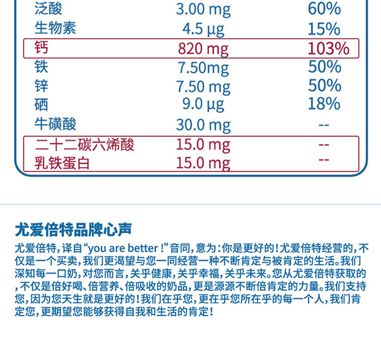 尤愛倍特,譯自“you are better!”音同,意為:你是更好的!尤愛倍特經(jīng)營的,不僅是一個(gè)買賣,我們更渴望與您一同經(jīng)營一種不斷肯定與被肯定的生活。我們深知每一口奶,對您而言,關(guān)乎健康,關(guān)乎幸福,關(guān)乎未來。您從尤愛倍特獲取的,不僅是倍好喝、倍營養(yǎng)、倍吸收的奶品,更是源源不斷倍肯定的力量。我們支持您,因?yàn)槟焐褪歉玫模∥覀冊诤跄,更在乎您所在乎的每一個(gè)人,我們肯定您,更期望您能夠獲得自我和生活的肯定!