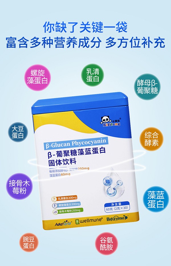 必慧龍β-葡聚糖藻藍(lán)蛋白,硬核雙保護(hù),解鎖好體質(zhì)!含量高,添加量足,原廠(chǎng)專(zhuān)利原料認(rèn)證授權(quán),富含多種營(yíng)養(yǎng)成分,多方位全面補(bǔ)充!每袋添加美國(guó)專(zhuān)利酵母β-葡聚糖250mg,乳清蛋白200mg,藻藍(lán)蛋白60mg,螺旋藻蛋白200mg以及接骨木莓粉250mg,同時(shí)特別添加綜合酵素及多種維生素,一袋滿(mǎn)足每日保護(hù)力所需!不含防腐劑、人工色素、麩質(zhì),放心好選擇,給力助成長(zhǎng)!