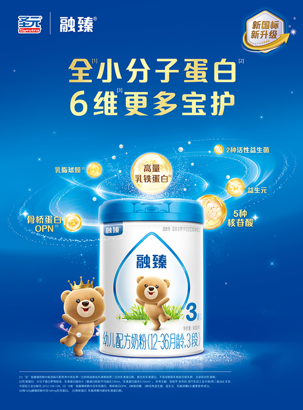 圣元融臻新國標奶粉采用的是全乳清蛋白配方,乳清蛋白的含量高達90%以上,乳酪比9:1,與初乳蛋白的比例保持一致,好消化,易吸收!針對寶寶生長發(fā)育的需求,特別添加了6維寶護因子,每100g添加乳鐵蛋白100mg、益生元3100mg、50mg的5種核苷酸;另外還添加了2種活性益生菌,乳脂球膜以及骨橋蛋白OPN,6重保護因子,助力寶寶擁有超強的自護力。