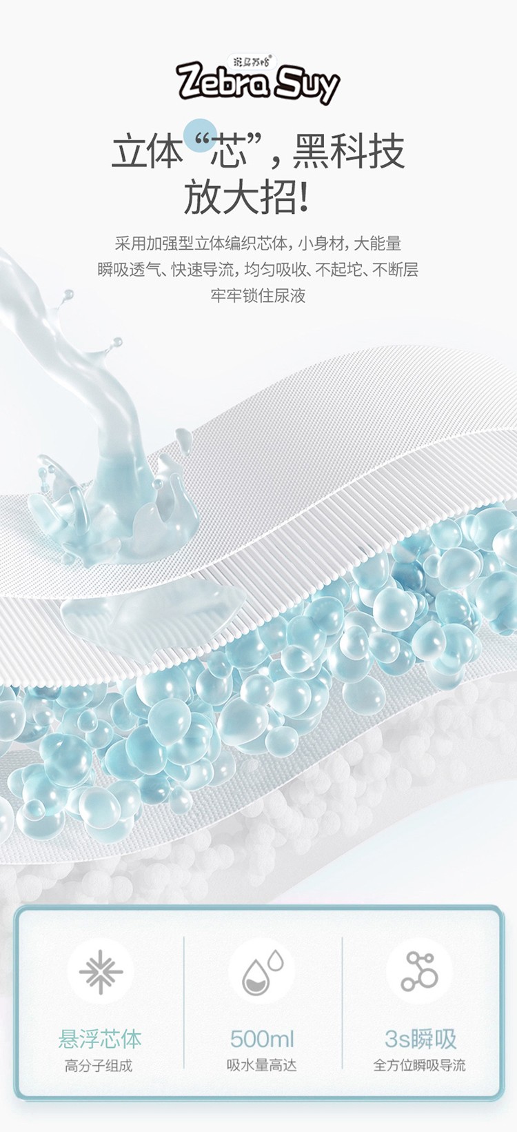 斑馬蘇怡紙尿褲/拉拉褲,大環(huán)腰加高護圍,加寬腰圍設(shè)計,柔軟有彈性,貼合身形不勒肚肚;輕柔蓬松3D熱風立體棉層雙倍親膚的柔軟,如云觸感,宛若初生;薄約0.1cm輕薄芯,薄如一枚硬幣,小PP沒負擔;立體“芯”,不止于薄還超能吸,增加前后吸水面積,容納寶寶大尿量;360°環(huán)抱寶寶小腰身,配合3D立體剪裁,動感貼合寶寶曲線,隨心所動;采用加強型立體編織芯體,內(nèi)含魔力縮水珠,瞬吸透氣,快速導流,均勻吸收,不起坨、不斷層,牢牢鎖住尿液;雙層5cm加高防漏側(cè)擋,隨心動;靈敏智能尿顯,變色快,勤更換,給寶寶看得見的安心呵護。