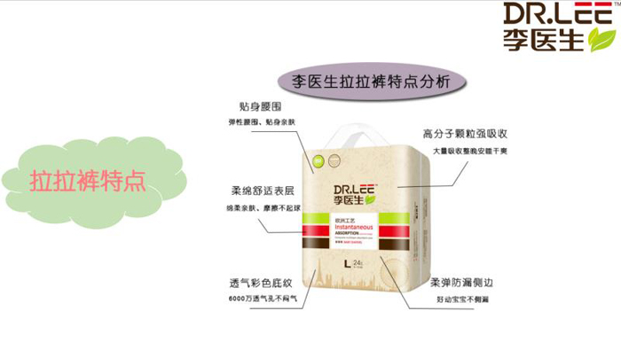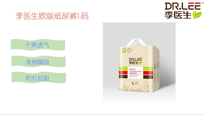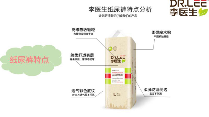 李醫(yī)生紙尿褲是李醫(yī)生的拳頭產品,面層、芯體、底膜均采用高端材質,質量在市場上占有絕對優(yōu)勢。產品特點是干爽、柔軟、透氣、吸水性好,同時具有不斷層、不起陀等特點,能夠給寶寶最舒適得體驗。