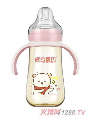 緣分寶貝玻璃奶瓶,符合人體工學(xué)弧形設(shè)計,自然流暢,易于捏握,防止滑落,美觀又好用,媽媽的好幫手。而且奶瓶把手緊扣是緣分寶貝奶瓶量身定做,大小合適,瓶身不易脫落。材質(zhì)安全無毒,不會損害寶寶的健康,爸爸媽媽可放心給孩子使用。