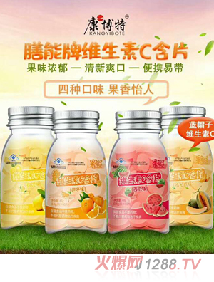 康博特膳能牌維生素C含片,有甜橙味、草莓味、青蘋果味、藍莓味四種口味,果味濃郁,清新爽口,小瓶便攜,隨時補充。