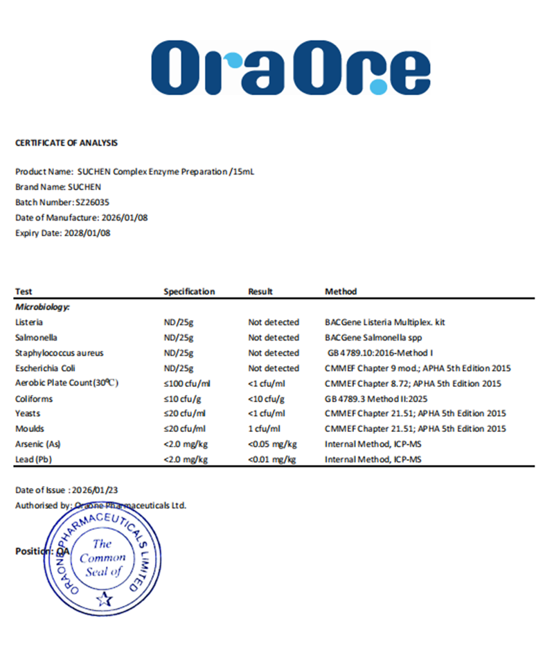 產(chǎn)品為新西蘭原裝進(jìn)口,生產(chǎn)商奧拉具備新西蘭藥廠級(jí)生產(chǎn)資質(zhì),并通過HACCP、GMP、FDA等國際權(quán)威體系認(rèn)證,生產(chǎn)環(huán)境與質(zhì)控體系達(dá)到藥品級(jí)標(biāo)準(zhǔn),該復(fù)配酶制劑類產(chǎn)品適用于新西蘭食品及膳食補(bǔ)充劑的生產(chǎn)和加工。