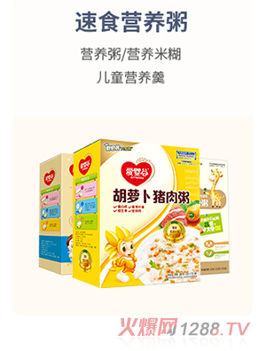 速食寶寶粥是將傳統(tǒng)的營養(yǎng)米粉和聞名全國的廣東粥品完美結(jié)合起來,既保持了營養(yǎng)米粉原有的營養(yǎng)成分,更重要是秉承了廣東“老火湯煲靚粥”的制作工藝和獨特風(fēng)味,使口感更佳,口味更多樣化,營養(yǎng)更全面,提供寶寶生長發(fā)育所需的多種營養(yǎng)成分。免煮、沖水即食、方便快捷、真材實料,是寶寶及兒童都喜愛的新一代營養(yǎng)食品。