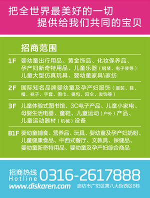 迪斯卡侖是一個(gè)高端孕嬰童體驗(yàn)式商場(chǎng),以多元化教育為主導(dǎo)的體驗(yàn)式購(gòu)物平臺(tái),是一個(gè)推廣品牌的好去處,為更好地推動(dòng)迪斯卡侖在線(xiàn)商場(chǎng)網(wǎng)絡(luò)營(yíng)銷(xiāo)業(yè)務(wù)的開(kāi)展,歡迎各品牌商戶(hù)在本網(wǎng)站投放特定形式的廣告。