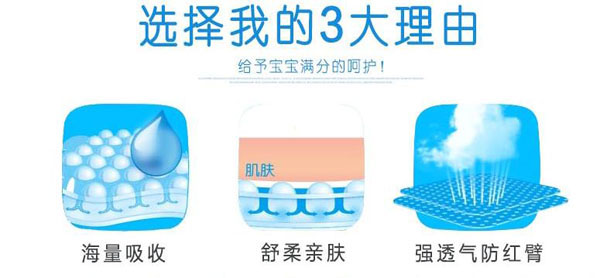 高分子吸收芯體,選用特殊復(fù)合芯體,吸收更快、更強韌、不易斷層。3D立體雙層防護,加強防漏能力能更好阻隔尿液外溢。雙層舒爽芯,進口住友+三大雅高分子完美配比,瞬間吸收、牢固鎖水。親膚透氣底膜,良好的透氣性的PE膜,形成有效的縱向?qū)α骺焖賹?dǎo)出廢氣和濕氣,沒有紅屁屁,讓寶寶的皮膚盡情的呼吸。360°雙層立體防側(cè)漏,寶寶怎么動都不怕。