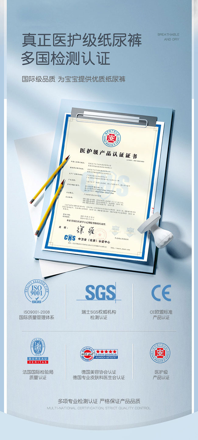 麥卡米卡嬰兒空氣感U芯紙尿褲,醫(yī)護級紙尿褲,多國檢測認證。羽毛般輕薄,薄至0.1cm,無感般穿著,透氣舒適,自有呼吸不悶熱;臺灣進口面層,梅花打孔設(shè)計,先進單層水刺布技術(shù),更輕薄,更柔軟親膚,讓寶寶的小屁屁更干爽,更舒服。日本進口芯體,不易起坨斷層,自主獨特吸水系統(tǒng),海量瞬吸;全方位立體打孔,底膜25000個透氣孔,迅速散熱排濕,甄護寶寶嬌嫩肌膚,遠離紅屁屁;羽柔細膩,不易移位,包裹更好;雙層防側(cè)漏,安睡一整晚。