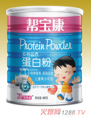 幫寶康多種營養(yǎng)蛋白粉含有豐富的乳清蛋白、DHA.鈣、鋅、維生素等營養(yǎng)元素,合理配方,精心研制,為中國bao--bao的健康成長貢獻自己的力量。